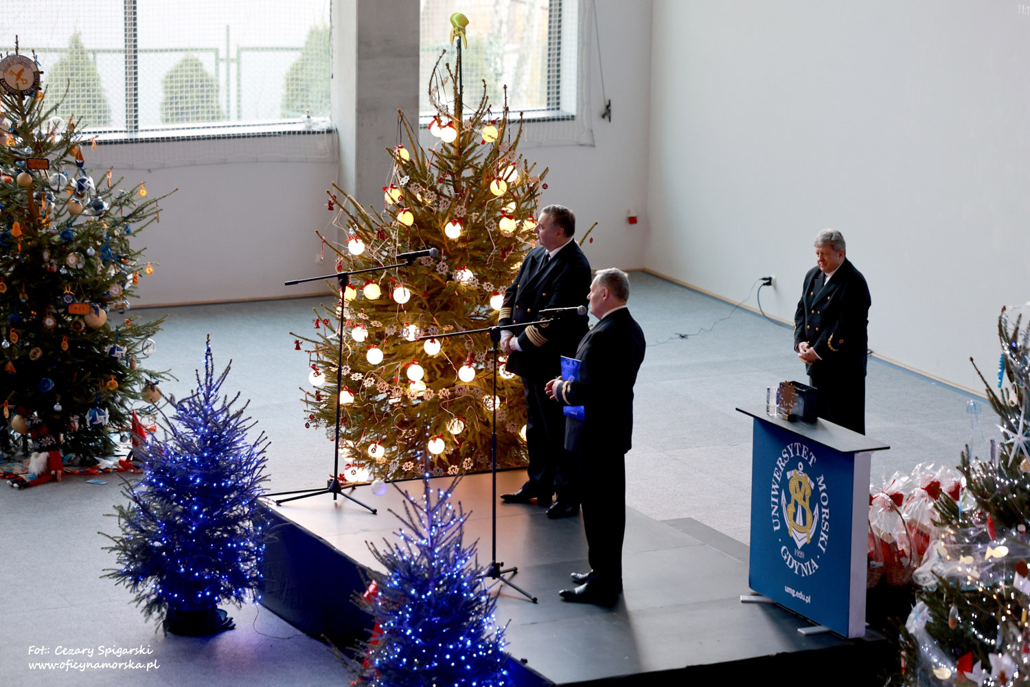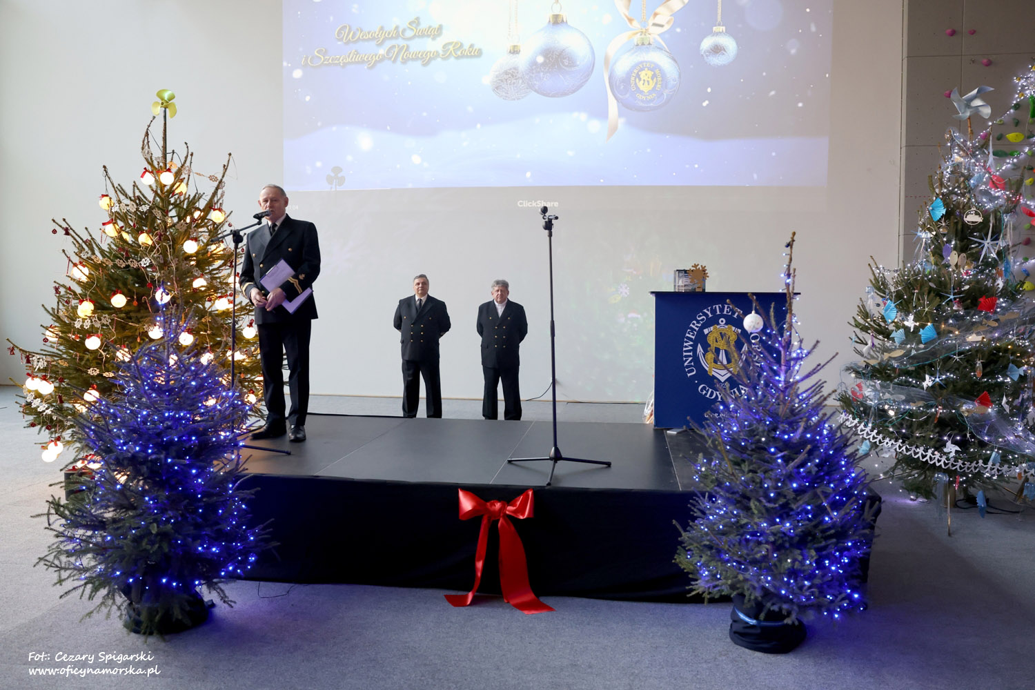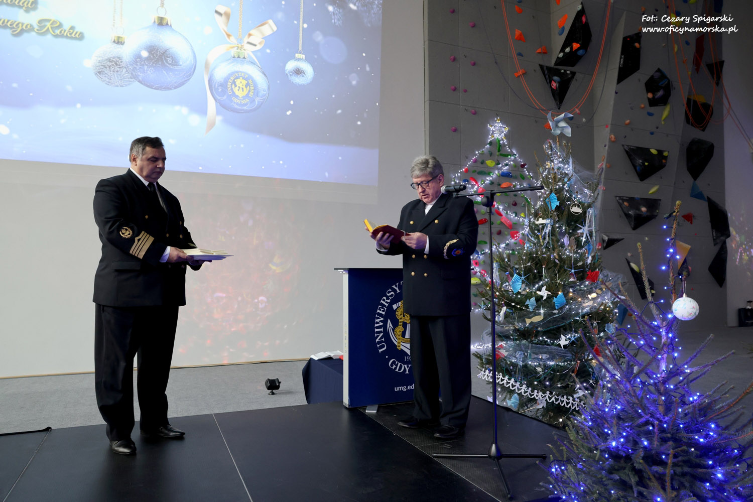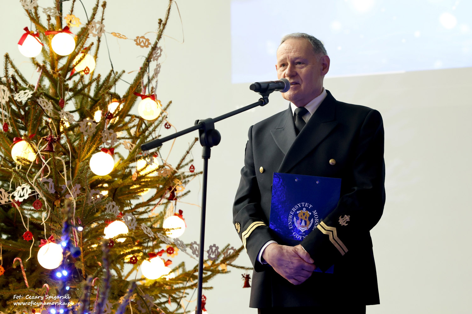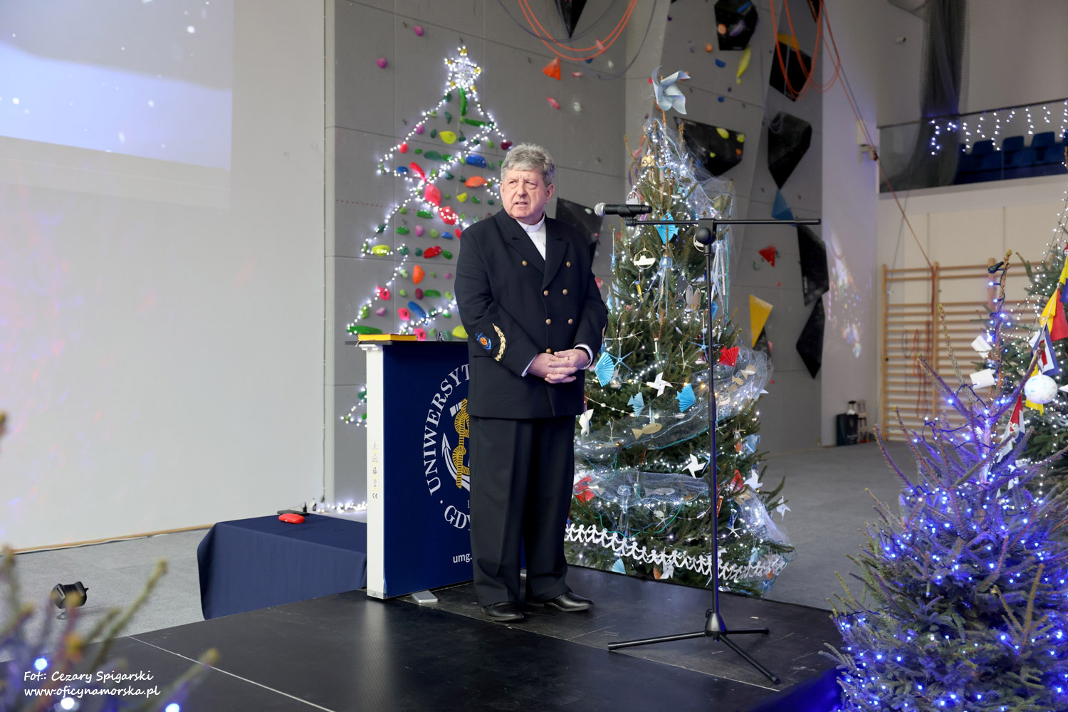Wydarzenie poprowadził mistrz ceremonii UMG, mgr Aleksander Gosk, który powitał zgromadzonych gości, a następnie oddał głos JM Rektorowi, prof. dr. hab. kpt. ż.w. Adamowi Weintritowi. JM Rektor, składając życzenia świąteczno-noworoczne, poprosił, aby w tym roku przy świątecznym stole wszyscy tutaj obecni życzliwie pomyśleli o tych, którzy w tym wyjątkowym okresie przebywają na morzu, będąc z dala od swoich bliskich i rodzin.