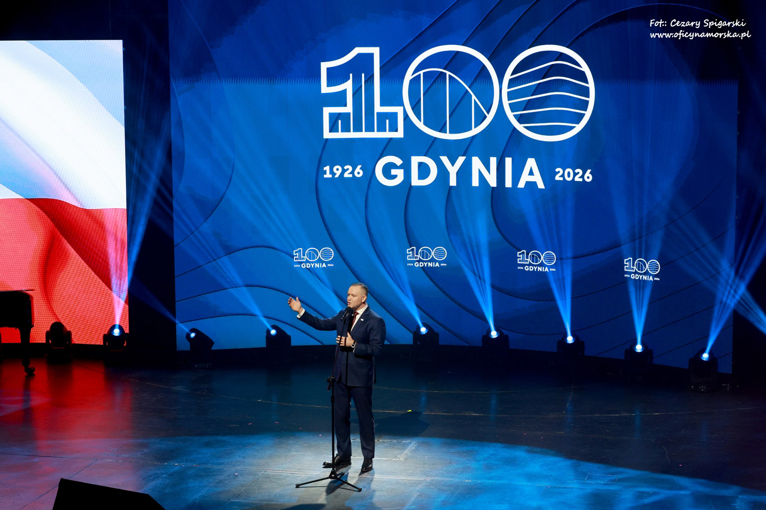 – Chciałbym pogratulować i podziękować mieszkankom, mieszkańcom Gdyni tego pięknego jubileuszu z głęboką świadomością tego, jak ważna jest dzisiaj dla Polski Gdynia. Dziękuję wszystkim państwu za to, że duch XXI wieku jest ciągle w tym wspaniałym mieście. Nie chcę być tylko kibicem rozwoju Gdyni. Chcę być z wami jako prezydent Polski, dlatego 4 miesiące temu złożyłem do polskiego Sejmu ustawę: Tak! dla polskich portów, w której zawarte są rozwiązania i portu zewnętrznego w Gdyni, i wybudowania i dokończenia inwestycji „drogi czerwonej”. To ustawa skierowana do wszystkich. Mam głęboką nadzieję, że z okazji jubileuszu 100-leciaGdyni będę miał okazję z przedstawicielami polskiego rządu powiedzieć, że ta ustawa przeszła przez polski parlament i zyskała podpis prezydenta. Mam nadzieję, że stanie się to na 101 urodziny.