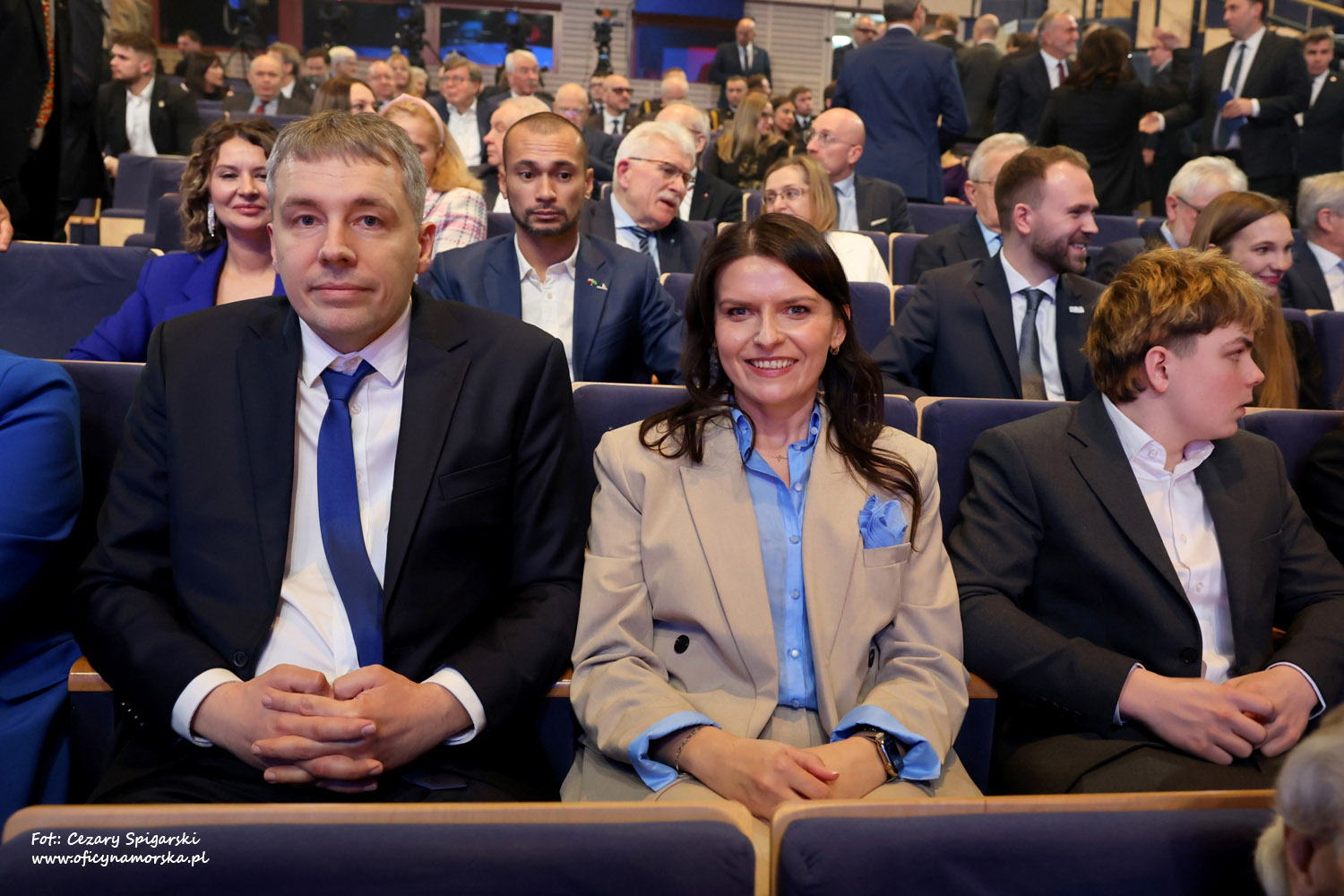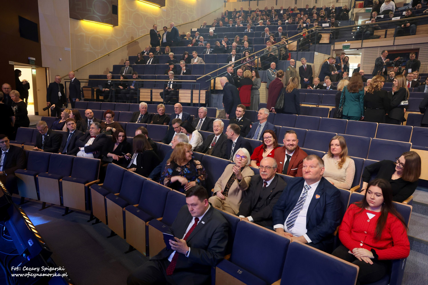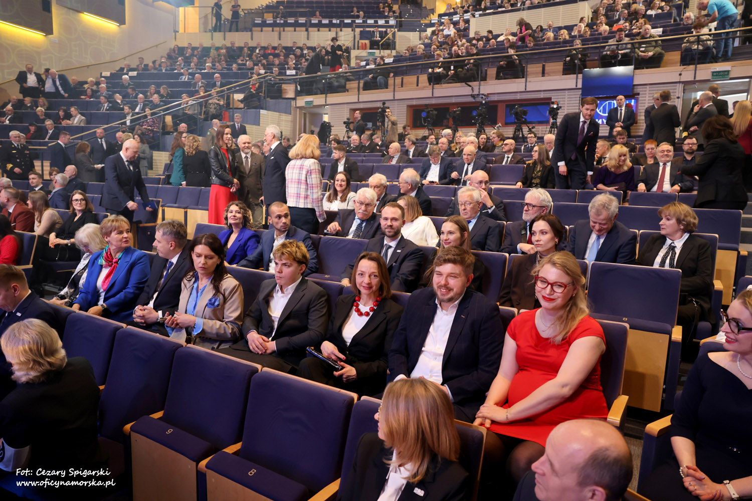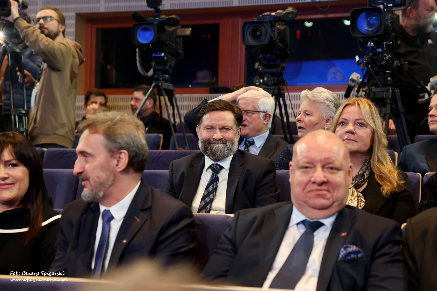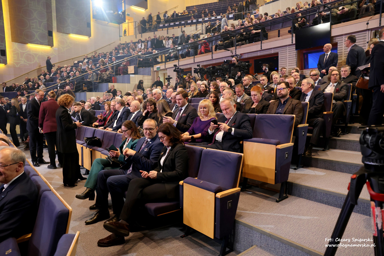 Przy dźwiękach muzyki, błyskach fleszy aparatów fotograficznych pan prezydent Karol Nawrocki oraz towarzyszące mu osoby zajęli miejsca na widowni.
