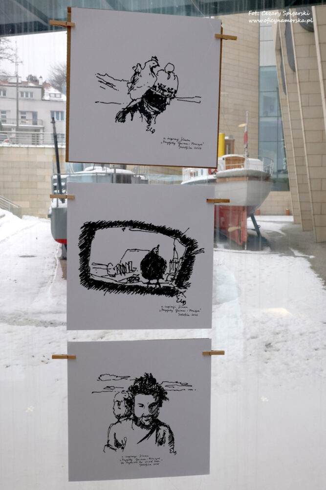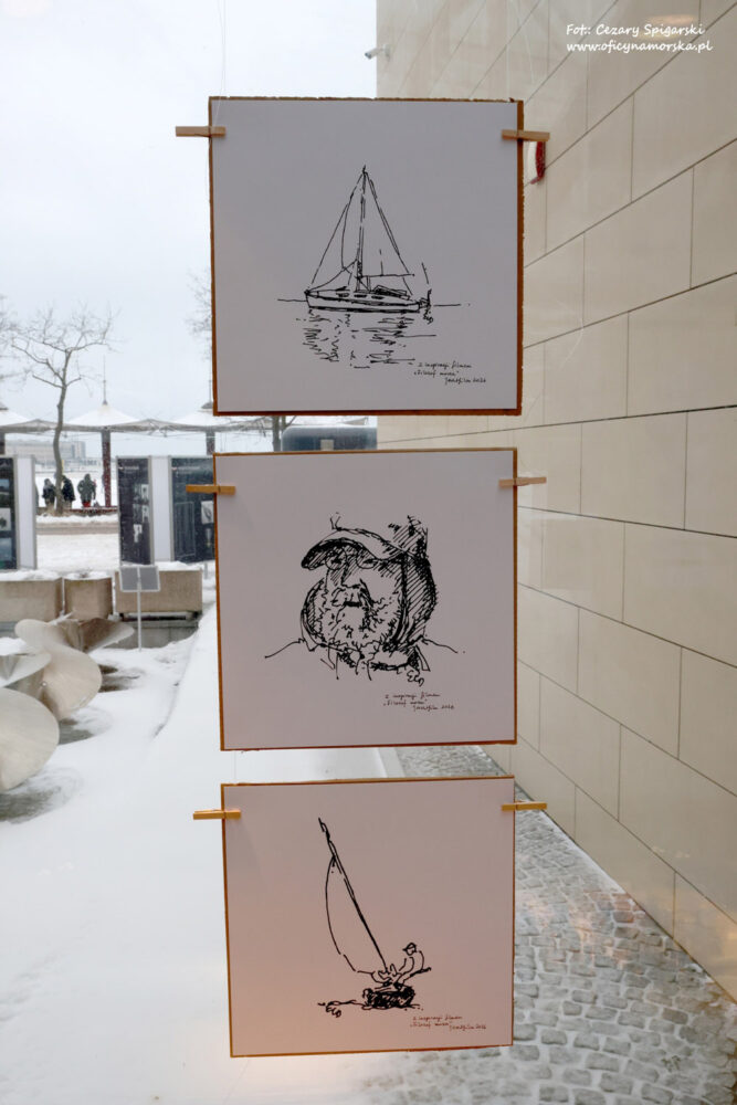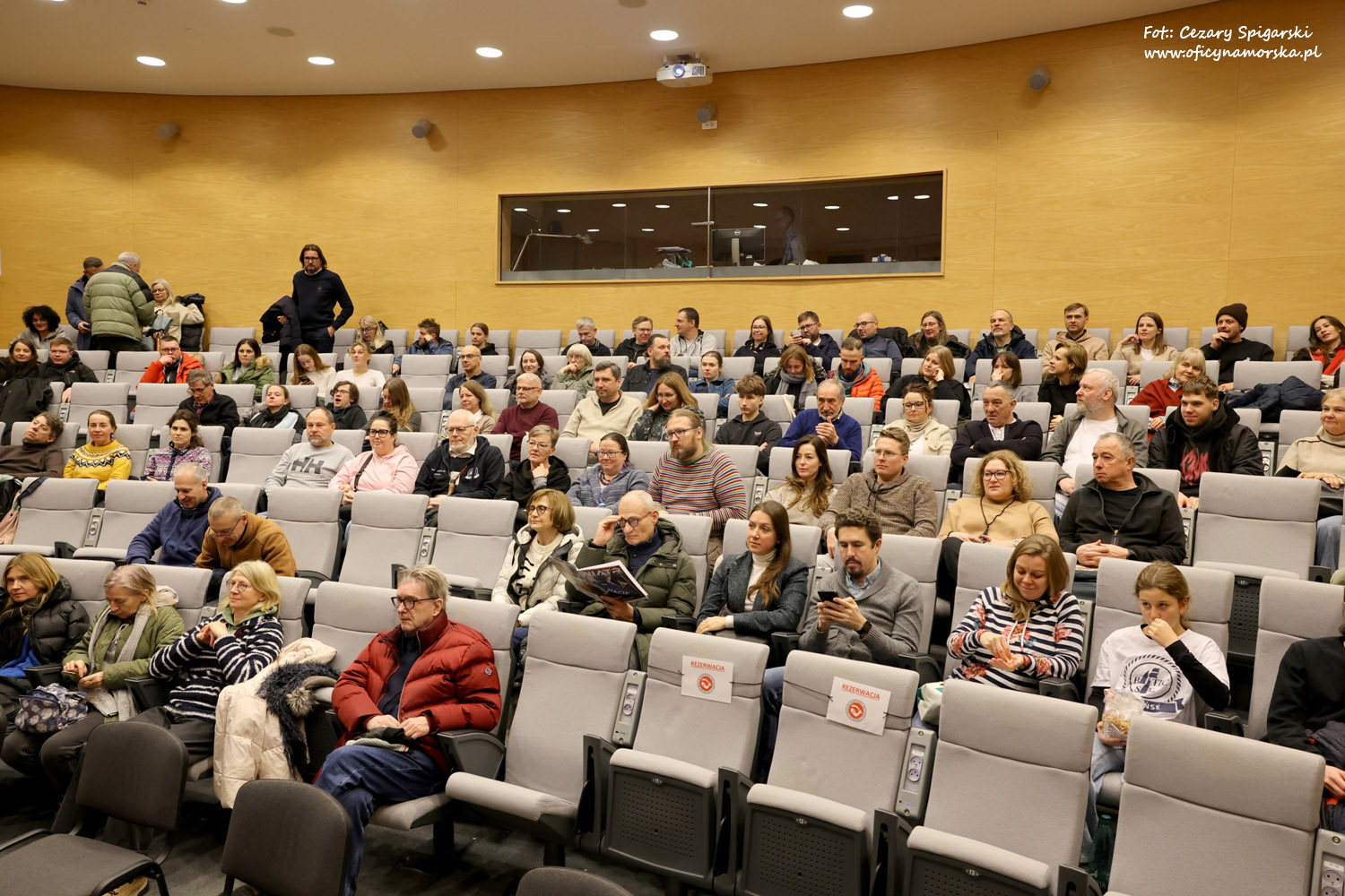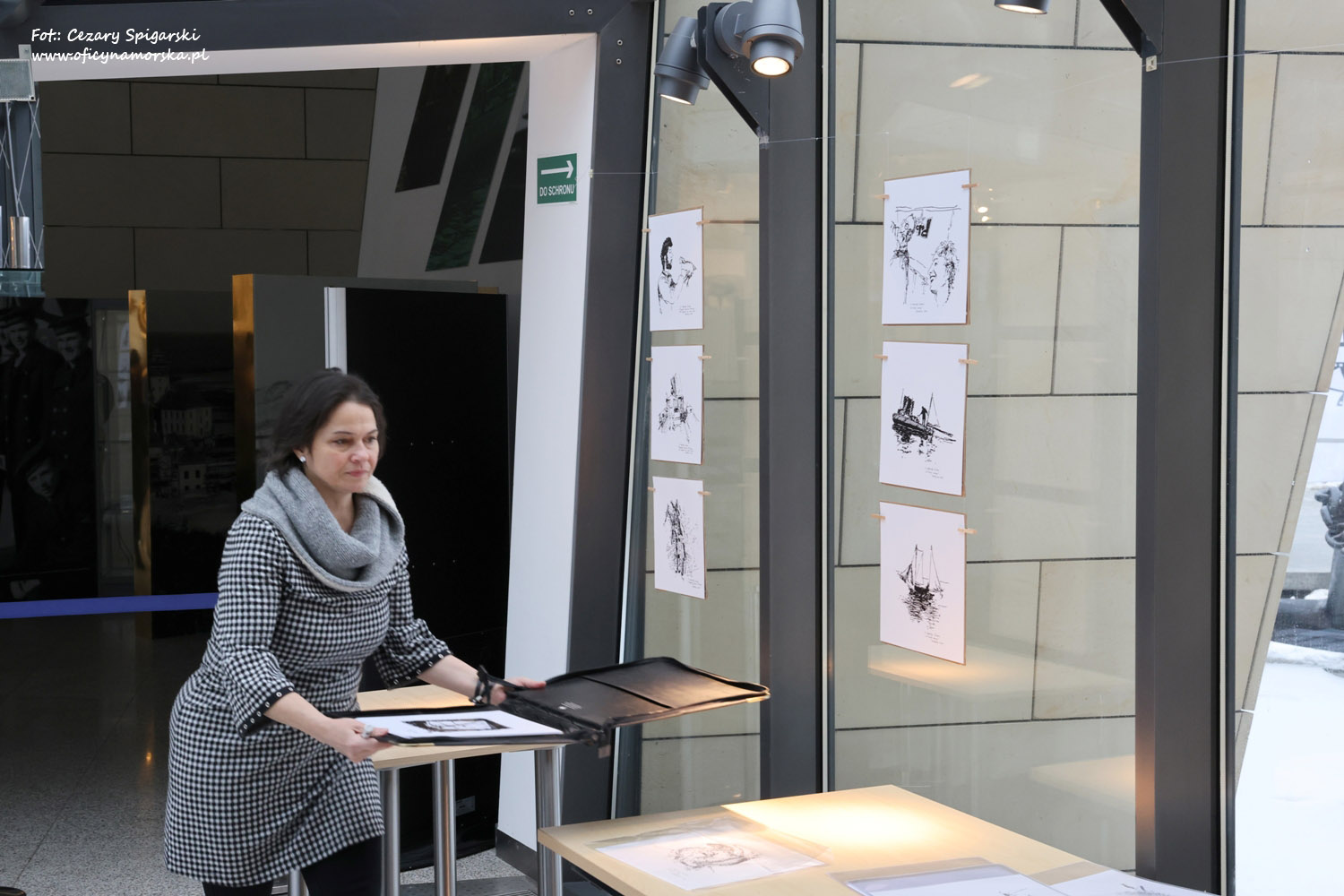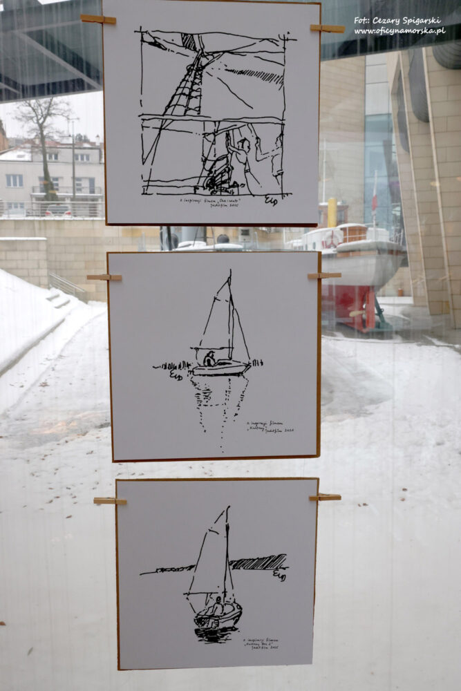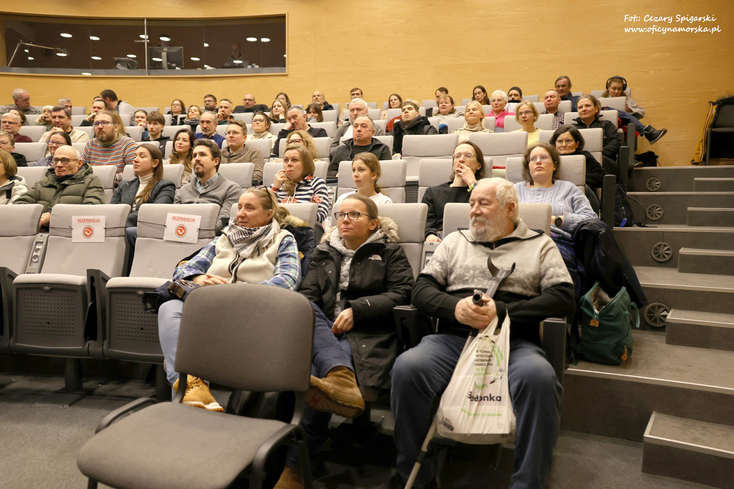 Trzeba przyznać, że sala pierwszego dnia festiwalu była pełna, cały czas wypełniała się jeszcze spóźnialskimi. Bilety wyprzedano dużo wcześniej. Festiwalowi towarzyszyła wystawa szkiców marynistycznych, inspirowanych m.in. prezentowanymi właśnie filmami, autorstwa Elżbiety Drążkiewicz (dop. red. CS).