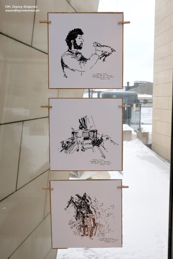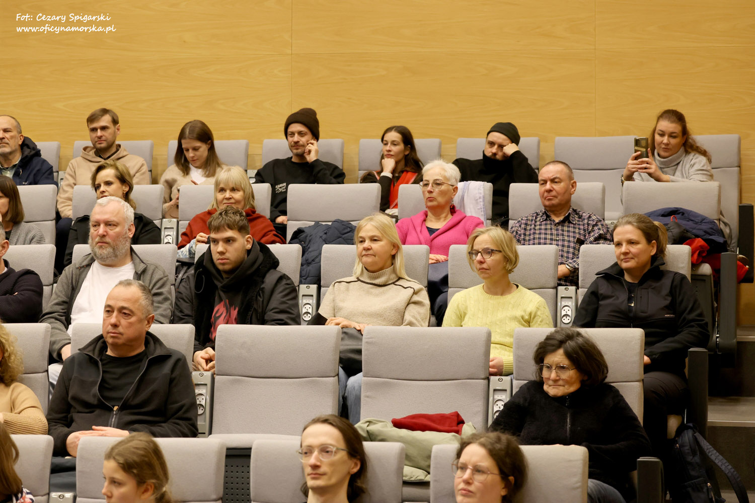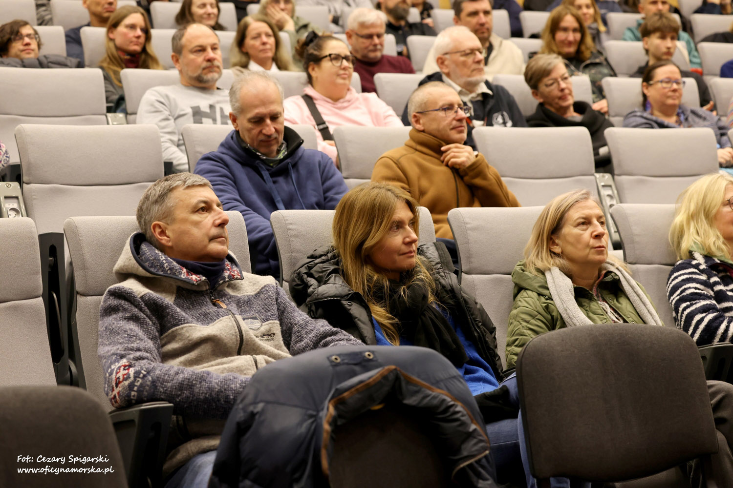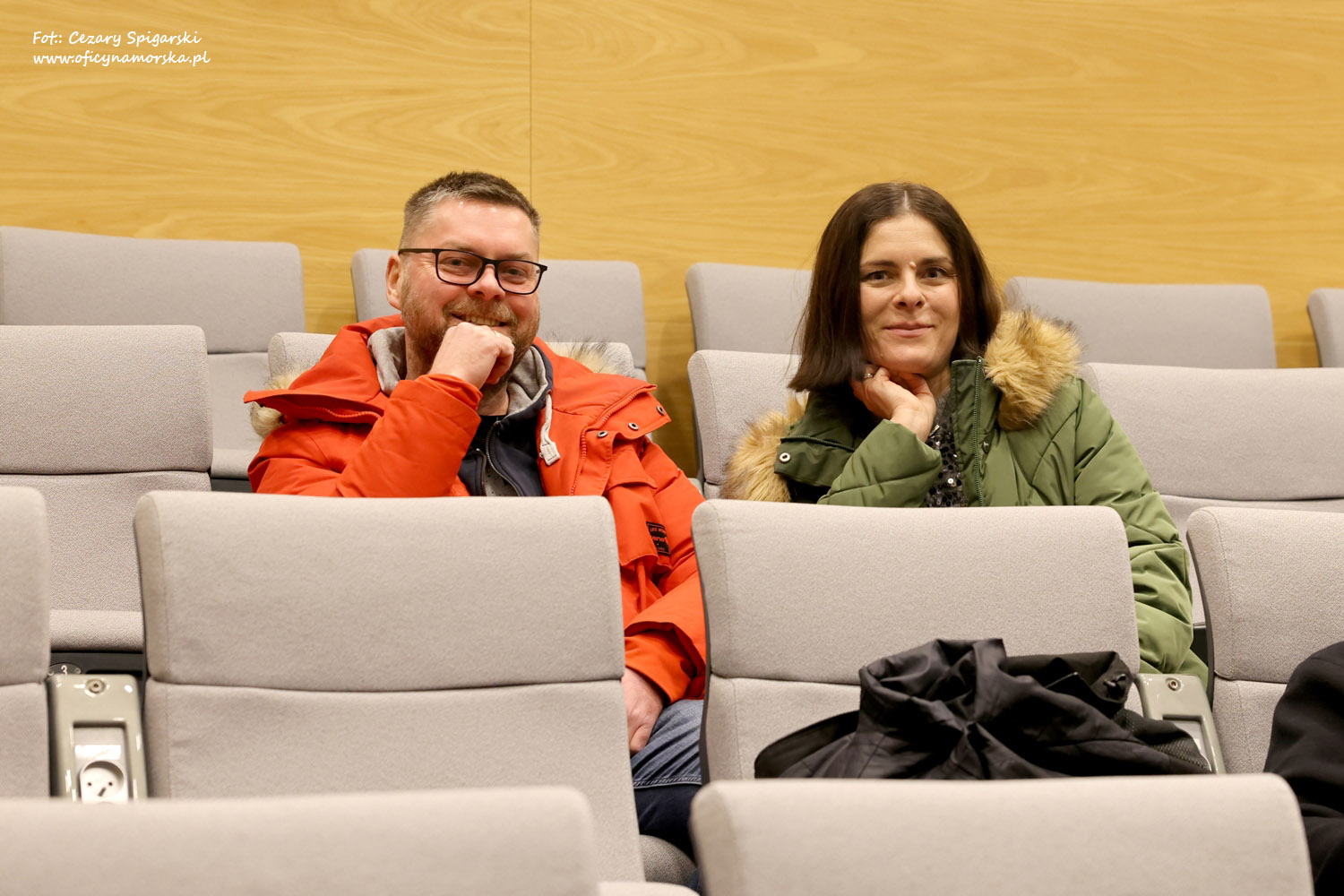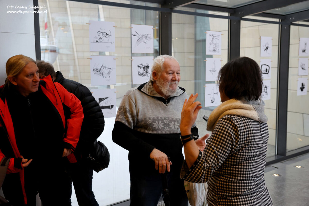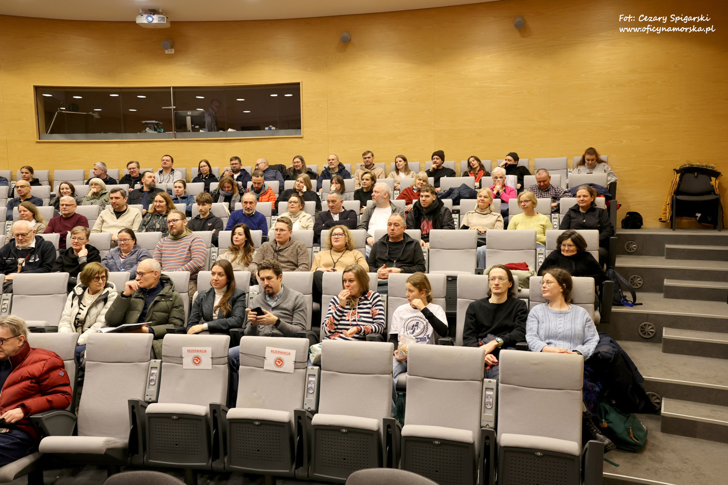 Trzeba przyznać, że sala pierwszego dnia festiwalu była pełna, cały czas wypełniała się jeszcze spóźnialskimi. Bilety wyprzedano dużo wcześniej. Festiwalowi towarzyszyła wystawa szkiców marynistycznych, inspirowanych m.in. prezentowanymi właśnie filmami, autorstwa Elżbiety Drążkiewicz (dop. red. CS).