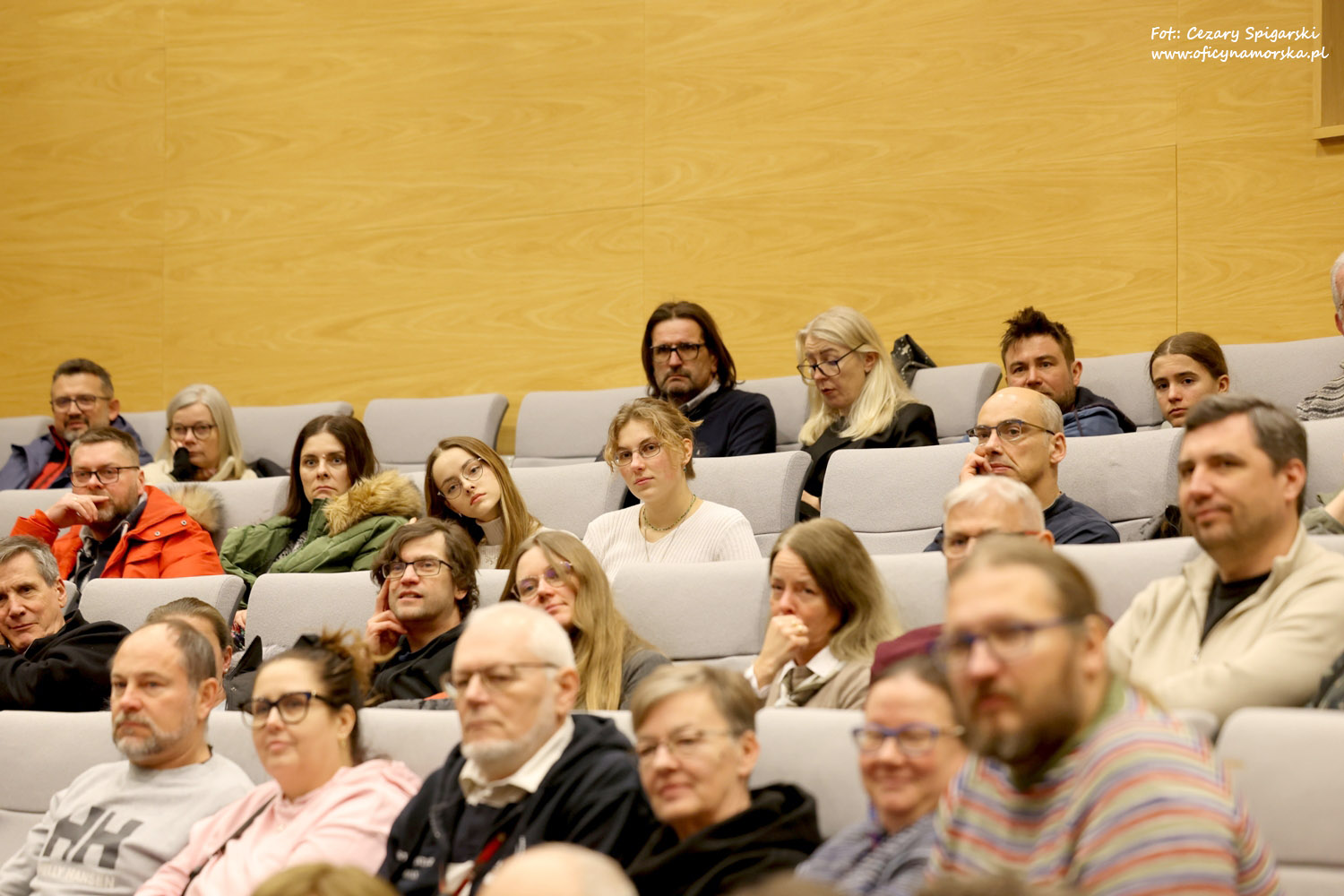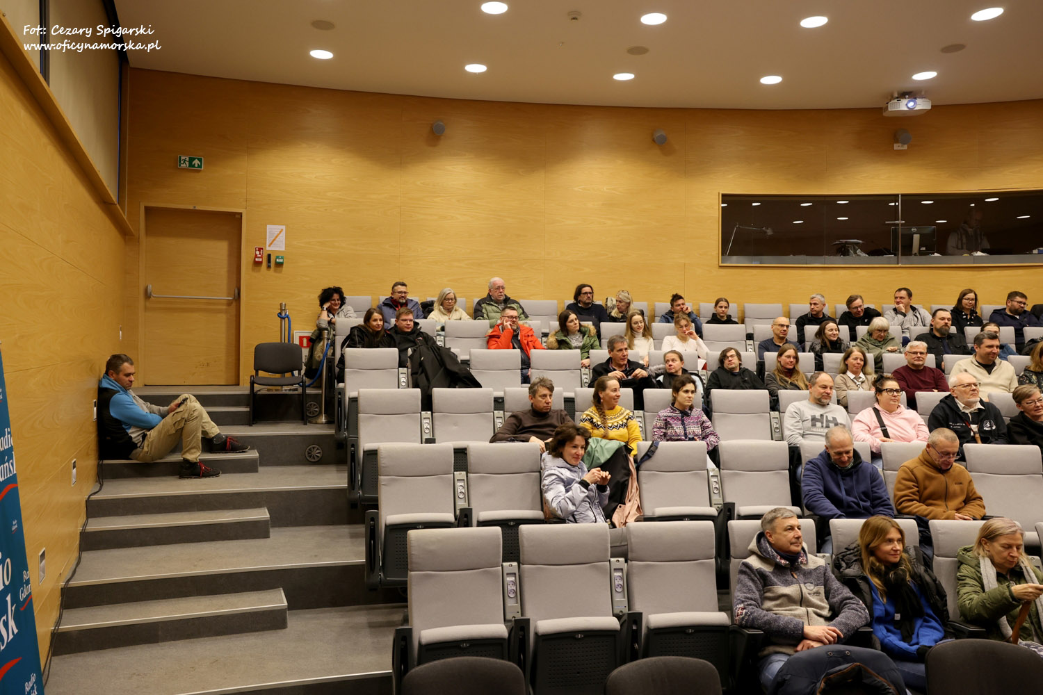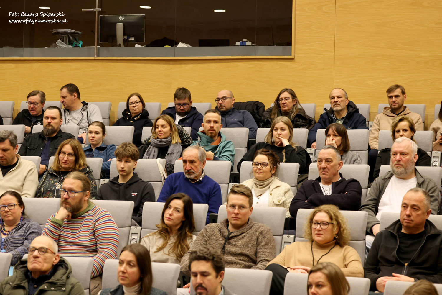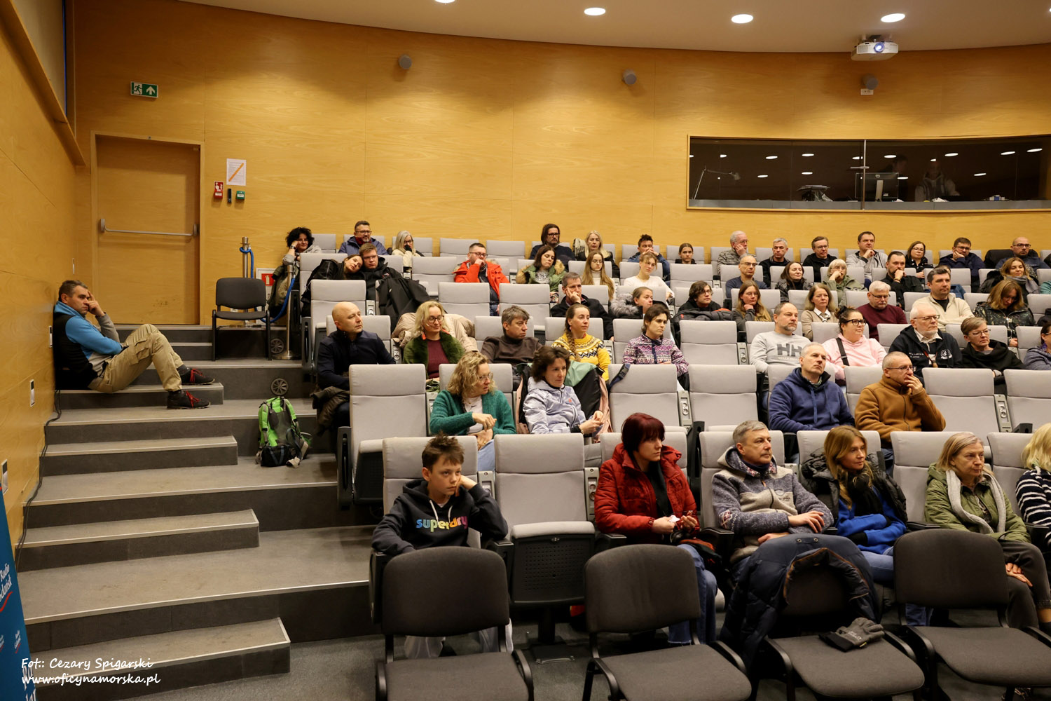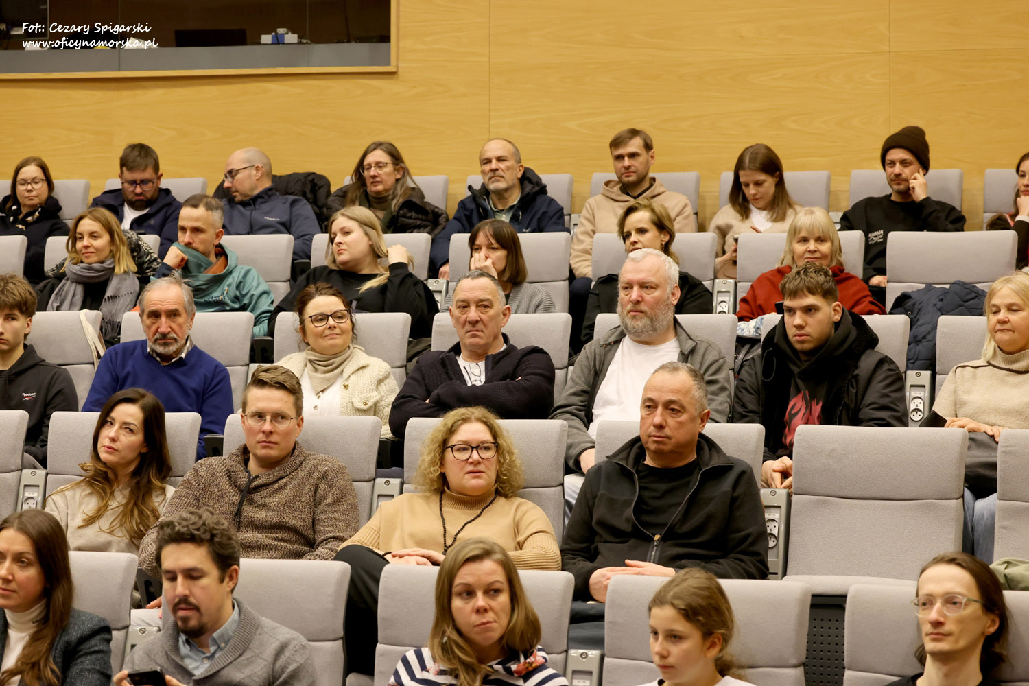 Trzeba przyznać, że sala pierwszego dnia festiwalu była pełna, cały czas wypełniała się jeszcze spóźnialskimi. Bilety wyprzedano dużo wcześniej. Festiwalowi towarzyszyła wystawa szkiców marynistycznych, inspirowanych m.in. prezentowanymi właśnie filmami, autorstwa Elżbiety Drążkiewicz (dop. red. CS).