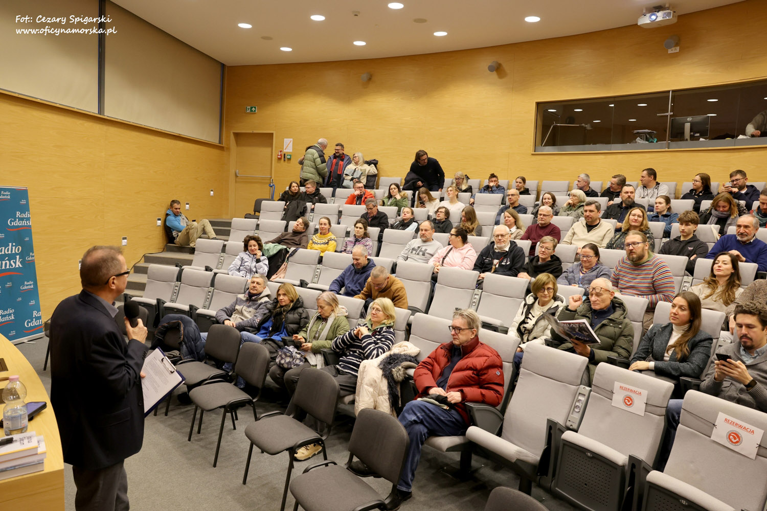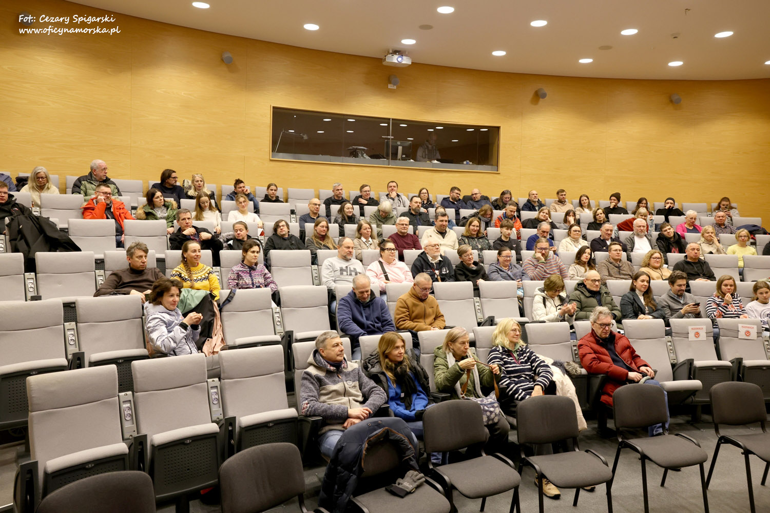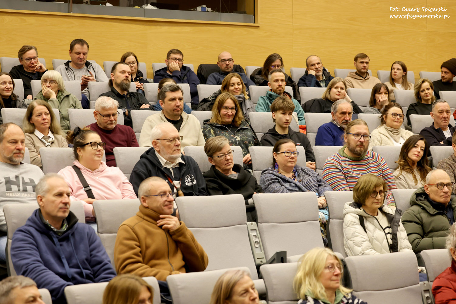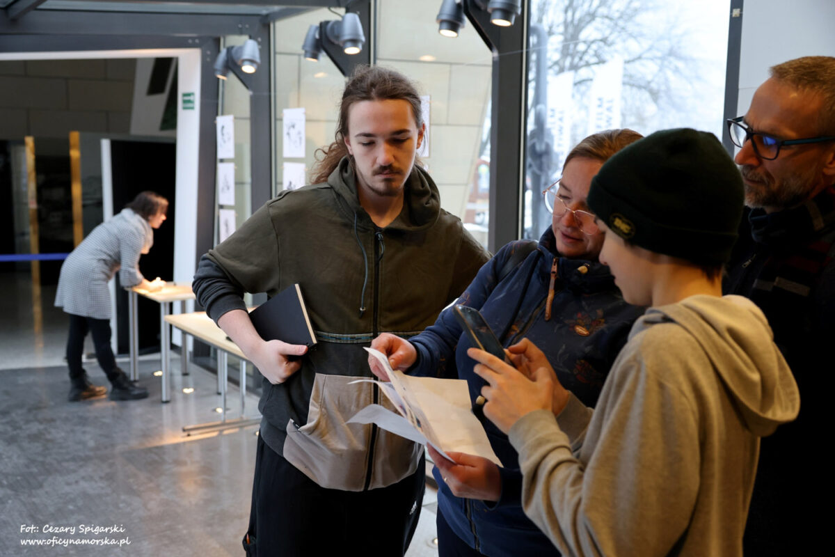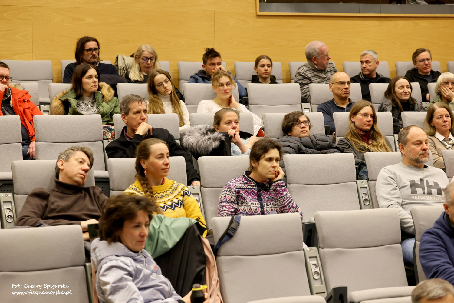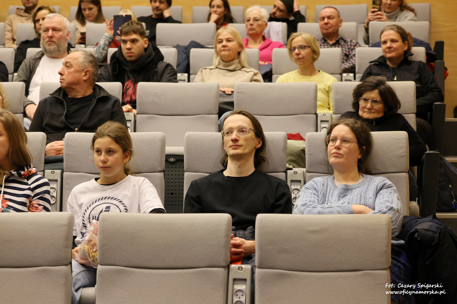 Trzeba przyznać, że sala pierwszego dnia festiwalu była pełna, cały czas wypełniała się jeszcze spóźnialskimi. Bilety wyprzedano dużo wcześniej. Festiwalowi towarzyszyła wystawa szkiców marynistycznych, inspirowanych m.in. prezentowanymi właśnie filmami, autorstwa Elżbiety Drążkiewicz (dop. red. CS).