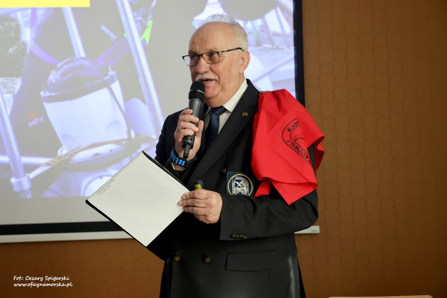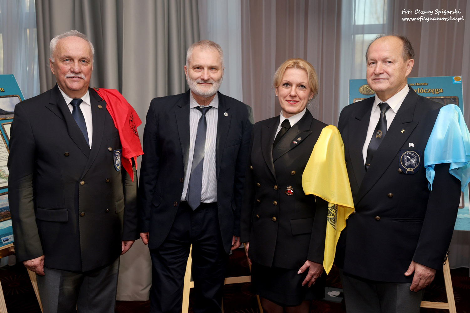 Nadszedł czas na podziękowania. Specjalne gratulacje otrzymali Janusz Nowak (czerwona chusta) i Jacek Sobuś (czerwona chusta) za pomoc w budowaniu wizerunku Stowarzyszenia. Wielkim oddaniem w organizację Konkursu ,,Kurs na Horn” i udziałem w rejsie hornowym wykazał się kapitan Tomasz Pietysz.