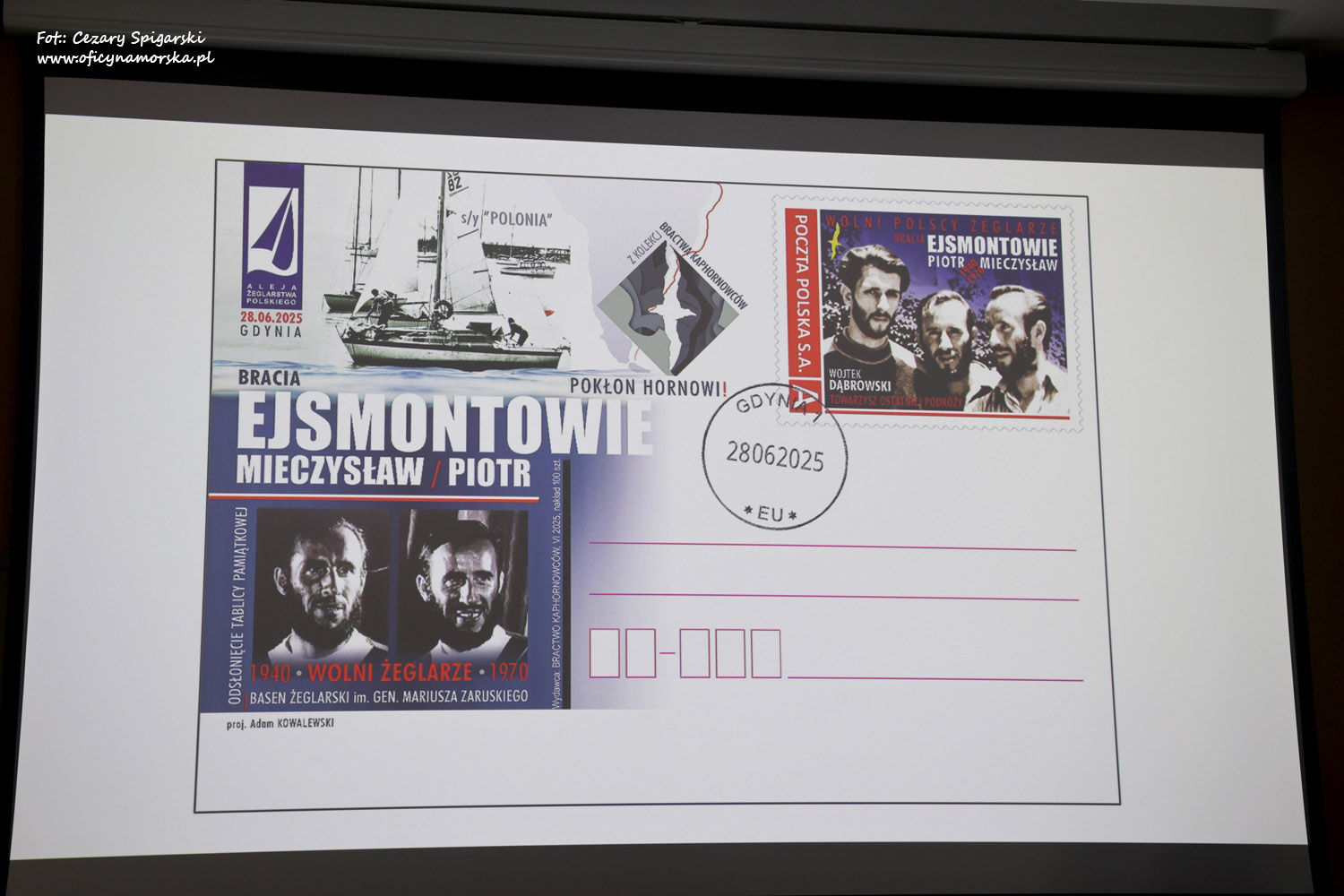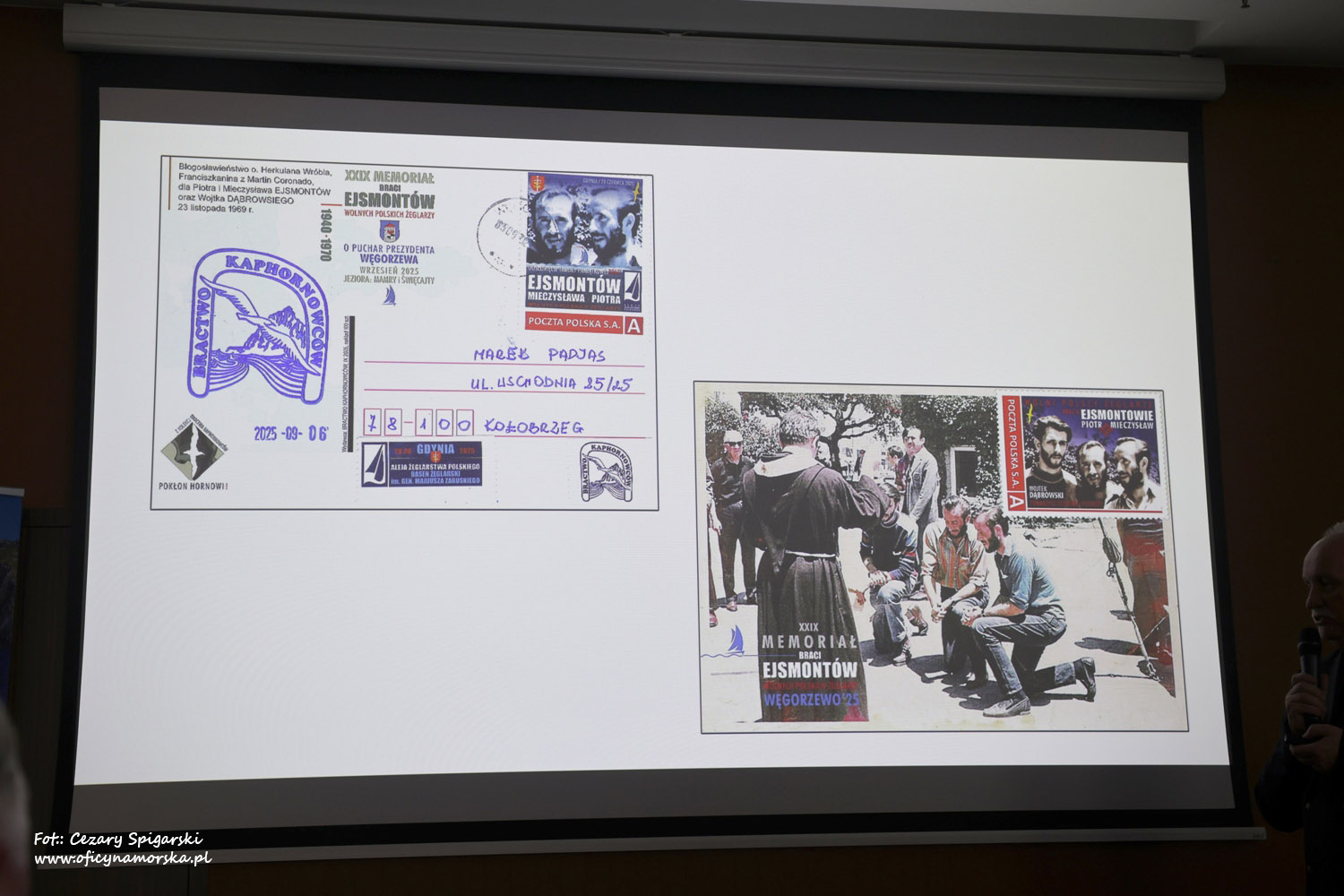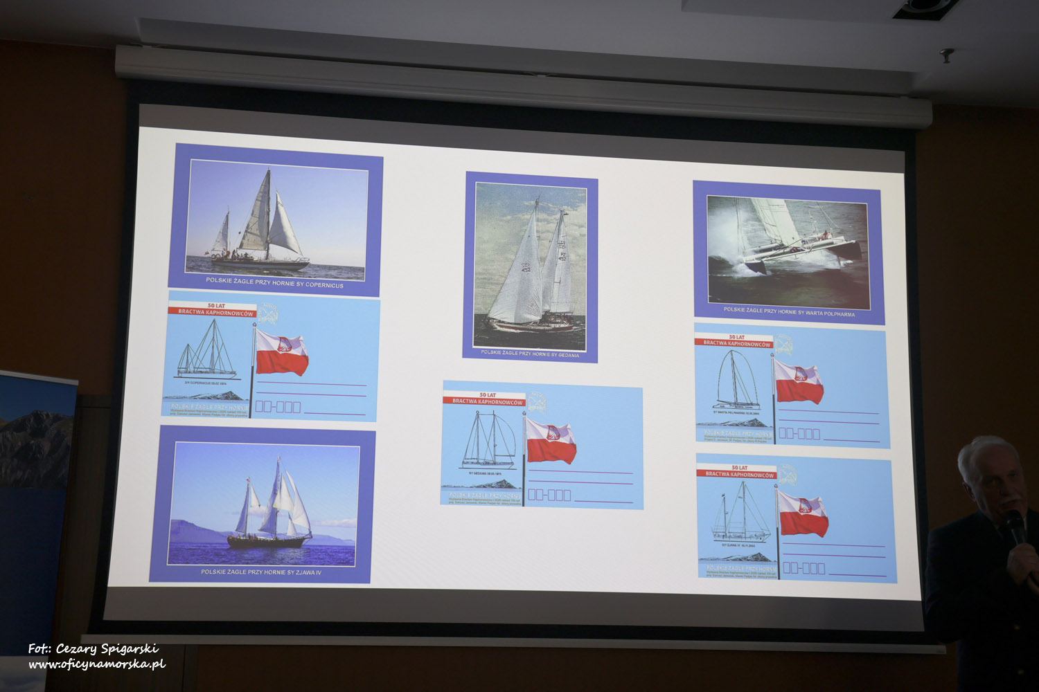 Po tych fascynujących relacjach wspólne zdjęcie żeglarskich sław i autografy na ,,zwodowanych” właśnie kartkach korespondencyjnych z kaphornowskiej serii ,,Polskie żagle przy Hornie” stały się faktem.