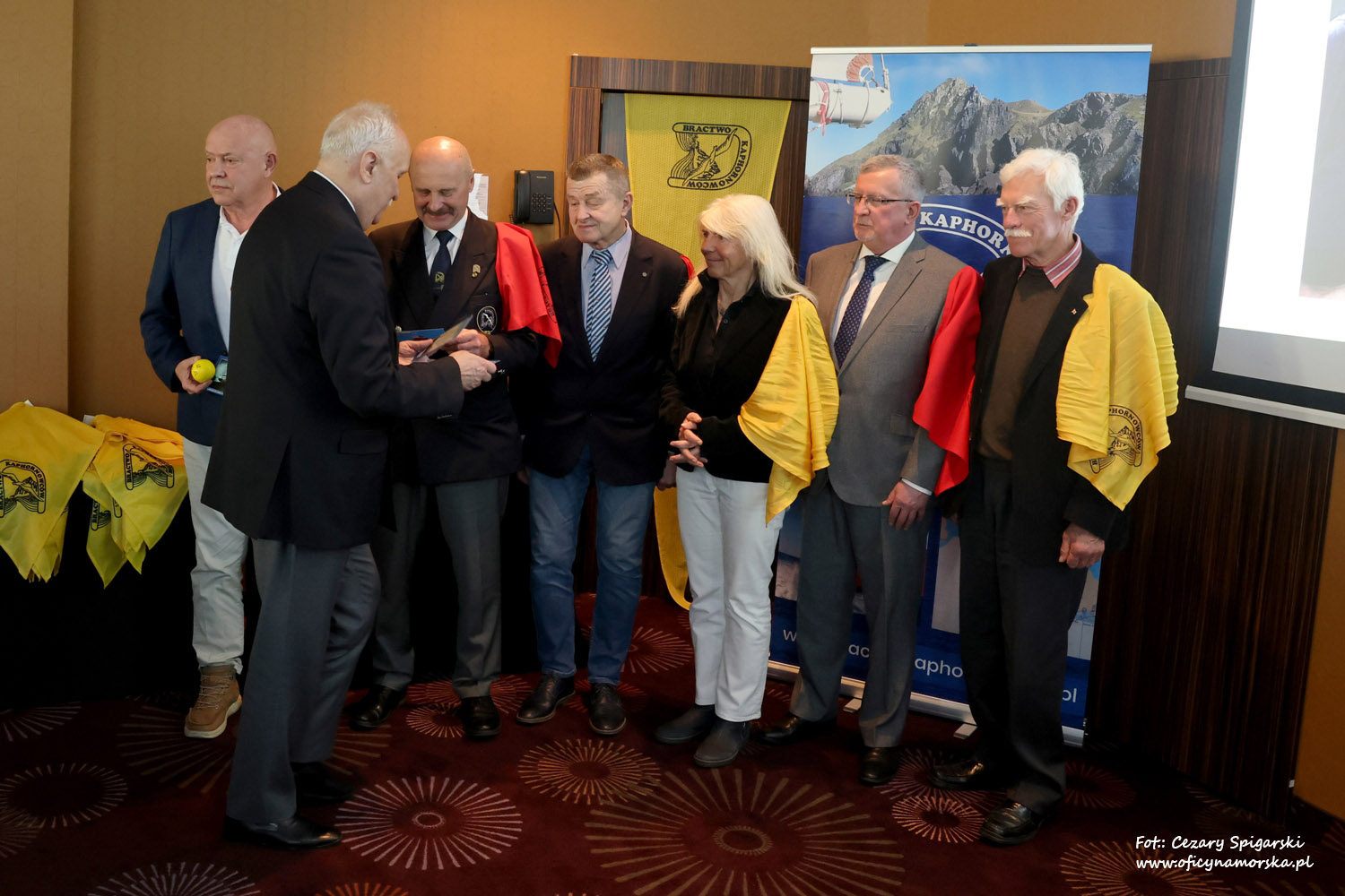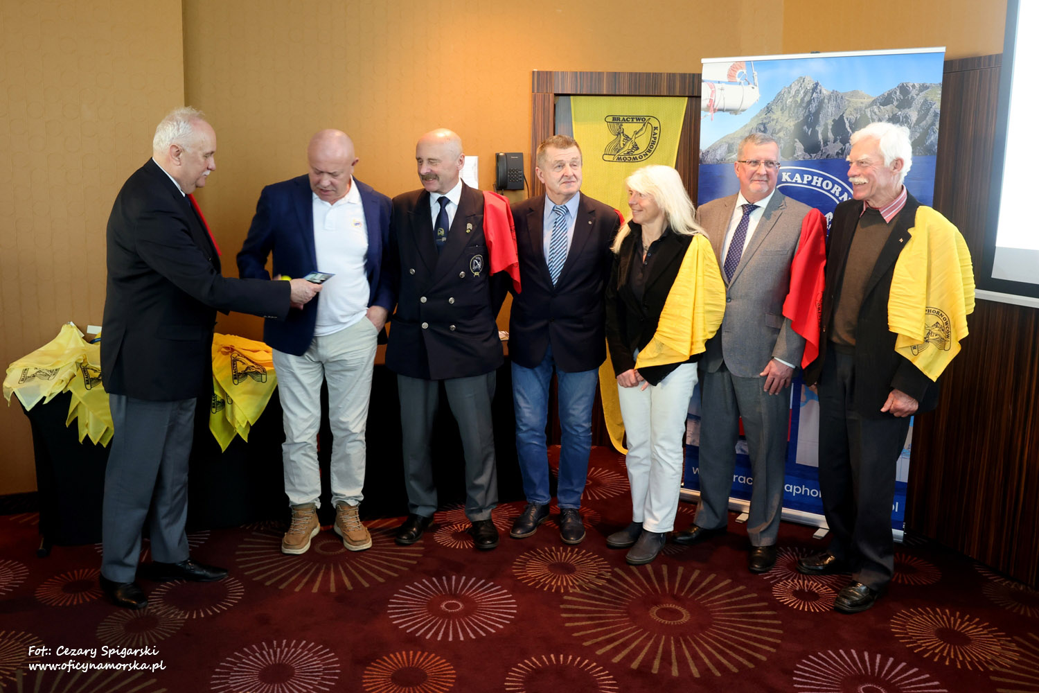 Żółte chusty, znak Bractwa Kaphornowcówi, nadanie imienia Albatrosa Hornu i wręczenia dyplomów dokonali: kadm. Czesław Dyrcz – były Grotmaszt i kmdr Marek Padjas – obecny Grotmaszt.