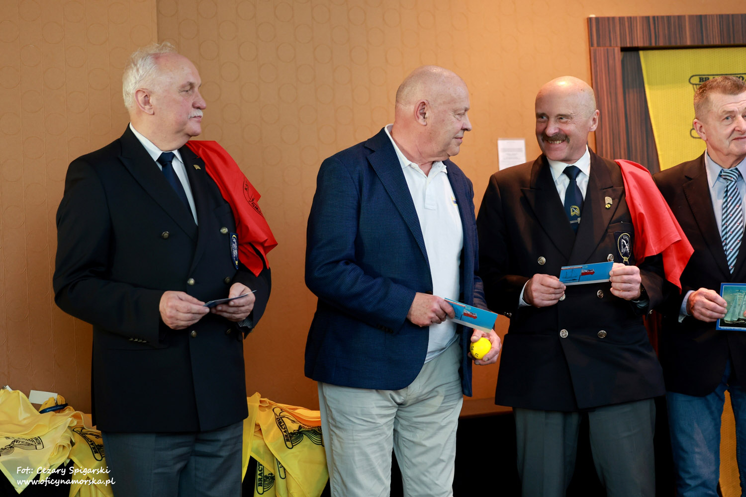 Nadszedł czas na podziękowania. Specjalne gratulacje otrzymali Janusz Nowak (czerwona chusta) i Jacek Sobuś (czerwona chusta) za pomoc w budowaniu wizerunku Stowarzyszenia. Wielkim oddaniem w organizację Konkursu ,,Kurs na Horn” i udziałem w rejsie hornowym wykazał się kapitan Tomasz Pietysz.